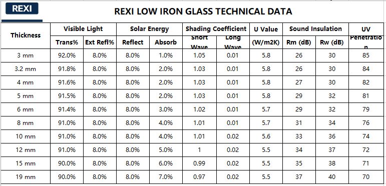 REXI Low Iron glass is an ultra-clear glass, also known as crystal clear glass and high-transparent glass. It is a high-quality, multi-functional new high-grade glass variety with a light transmittance of over 91.5%. It has the characteristics of crystal clear, high-grade and elegant, and is known as the “crystal prince” of the glass family.